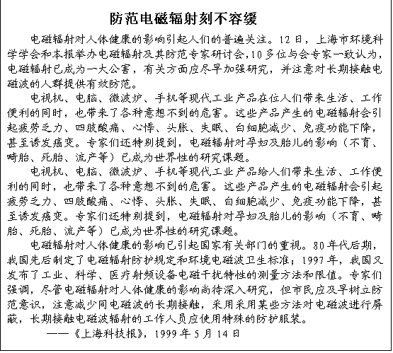 在您看电视的时候,您也许不会料到比高压电缆所产生的电磁波还要强的电磁辐射正笼罩着您;在您用移动电话谈妥一宗生意的时候,您不会想到手机天线集中释放的电磁波已经进入了您的体内……